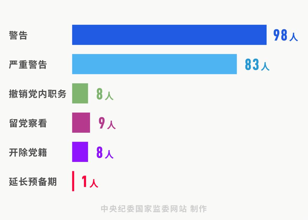 分析处分类型,受到党纪处分的共计207人,其中,警告98人,严重警告83人,撤销党内职务8人,留党察看9人,开除党籍8人,延长预备期1人;受到政务处分的共计42人,其中33人同时受到党纪处分;12人受到诫勉谈话、谈话提醒、调离岗位等处理。运用第一、二种形态处理人数,占处理总人数的92%。用足用好“四种形态”,咬耳扯袖、红脸出汗已成常态,监督执纪更加精准,使更多干部受到警醒,体现的是严管和厚爱结合。